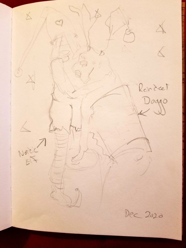 I chose a warm grey color palette with some deep reds and gold and went to work! I started drawing over her clothes, added a crazy gnome-elf hat and pointy shoes, and exaggerated the waistband and cuffs to be extra cartoony. For Fredo, I knew he had to be a reindeer but more caribou style, so I added a thick blanket more like a saddle pad, extra large horns, and a jingle bell with some ribbon for extra holiday goodness.