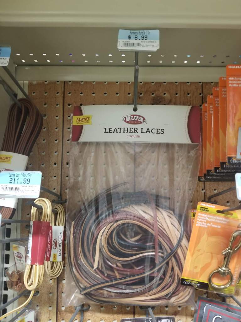 So what does this have to do with this DIY craft on leather bracelets, you ask? Well, in said horsey section yesterday, as my eyes glazed over for the hundredth time at the pegboard display of equestrian supplies, they fixated on this random package of leather laces that I never noticed before. I thought, ‘Hmm, weird, why are these here? Do riders fancy leather crafts?’ I must have said it out loud because the kid was yammering on about how the laces could be used to patch a bridle or something-something saddle blah blah. At the time of this post, it was $8.99 for the whole pack! A full pound of leather, in fact, as the packaging advertised. I didn’t know why I needed a pound of leather or what I was going to use a pound of leather for, but without any research or price comparison to Michael’s on their more cleverly marketed (expensive) leather craft goods, I dumped them in our cart.