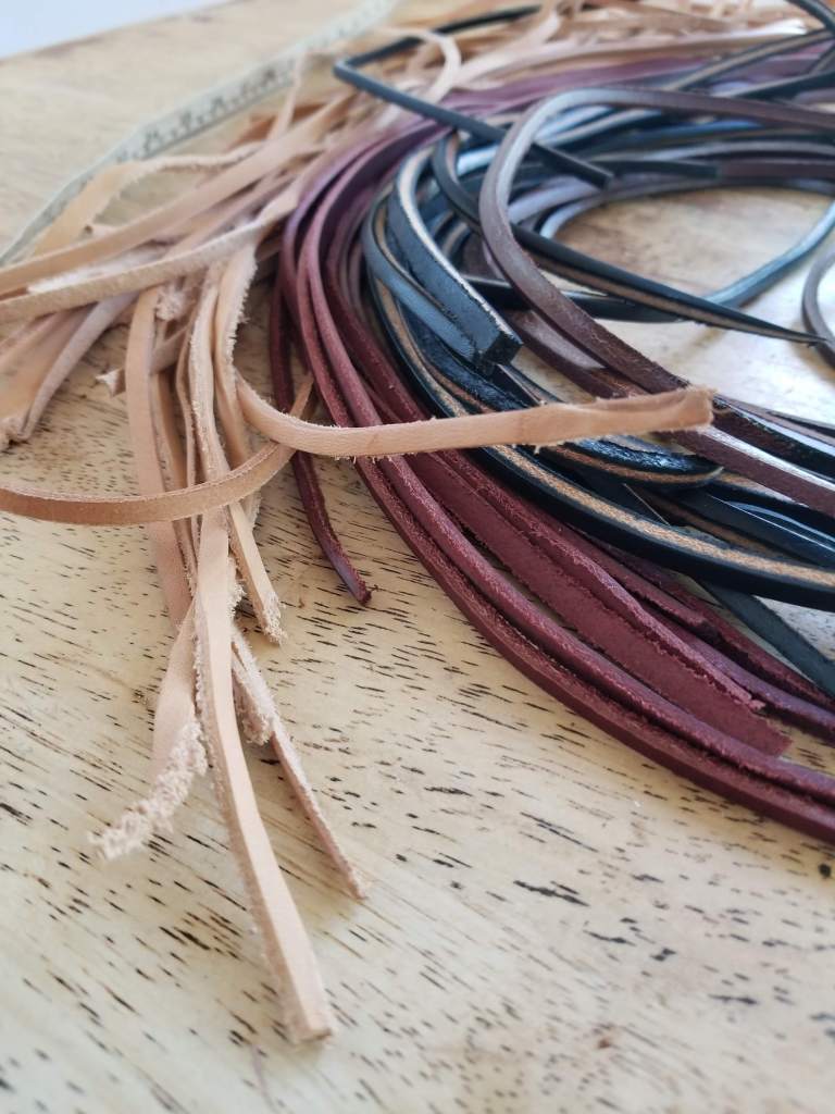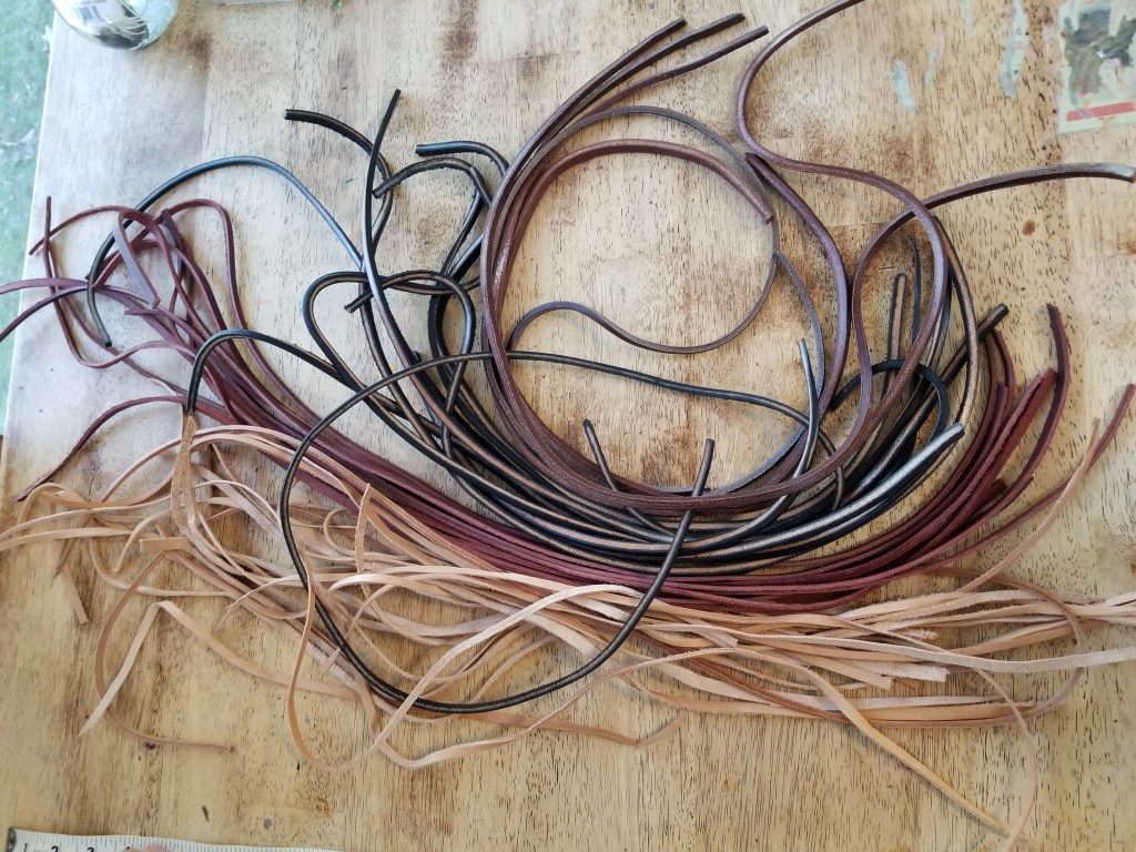 When we got home, I had Charlotte separate them out on the kitchen table by color and size and then do a count by each. Kids love that kind of activity; no clue why. There were 4 colors in the package: natural tan, burgundy (or oxblood for you Doc Martens fans), chocolate brown, and black. They were beautiful! All varied in thickness, stiffness, and length. A total of 53 strings, the shortest at 18 “inches and the longest at 34 “. What a bargain! Imagine all the stuff we could make with a pound of leather!!