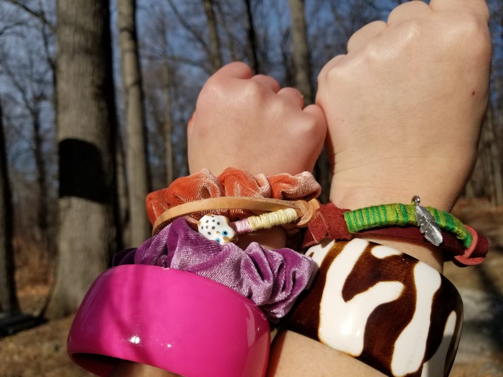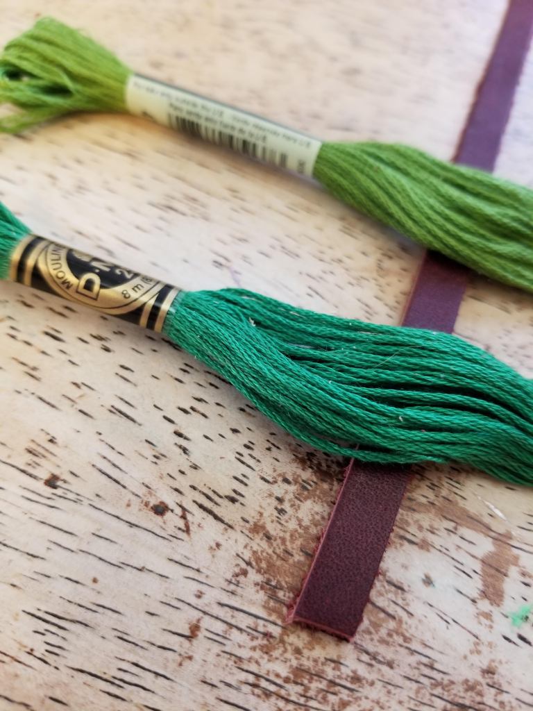 I also do not currently own embroidery thread; my 10-year-old unicorn-loving daughter does. She has, like, 7 colors in her craft box from a failed attempt at learning how to hoop embroider a rose, so I was left choosing my bracelet colors from her Lisa Frank database. I kept it simple and chose 2 shades of green that looked best against the oxblood leather. She chose Neapolitan ice cream colors against the natural tan leather, and I have to say it was a superb choice. My taste in punk music may not be influencing her anymore at the moment, but at least my design aesthetic is!