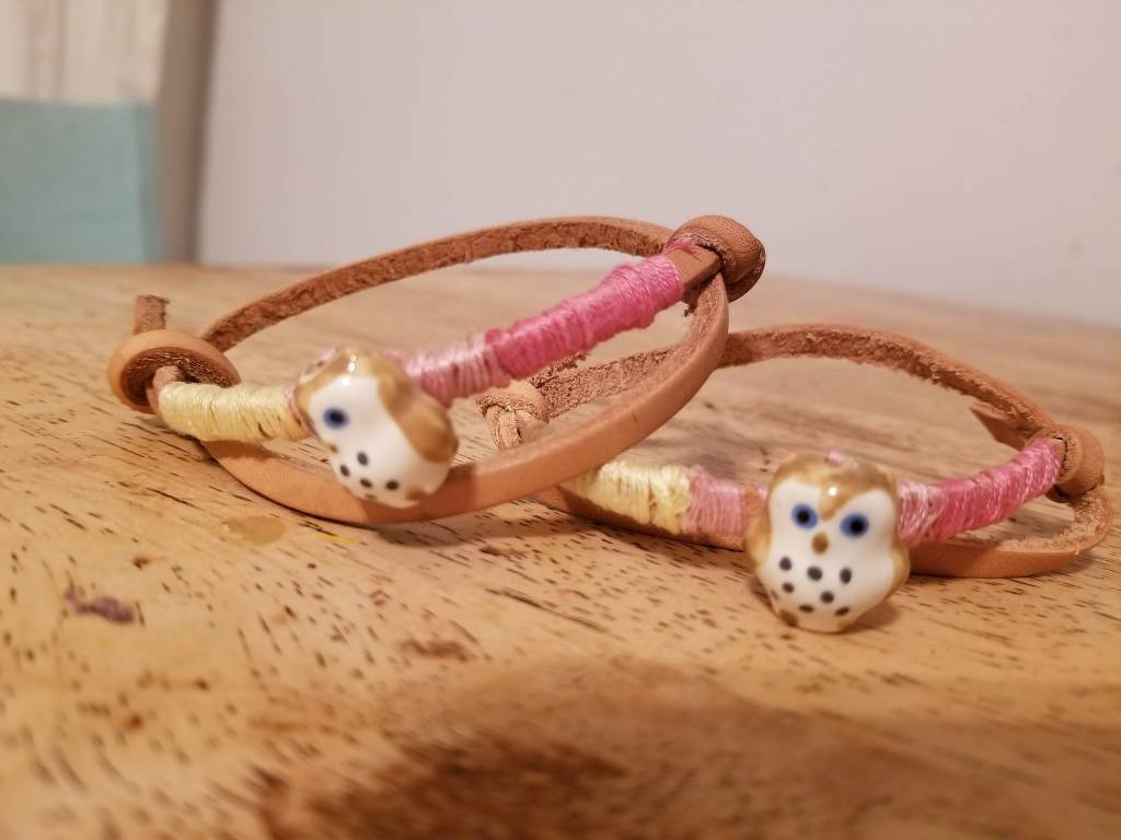 We opted to add some charms and beads: a feather for me and some ceramic owl beads for Charlotte and the one she made for her BFF. We just sewed them onto the center of the existing wrapped thread.