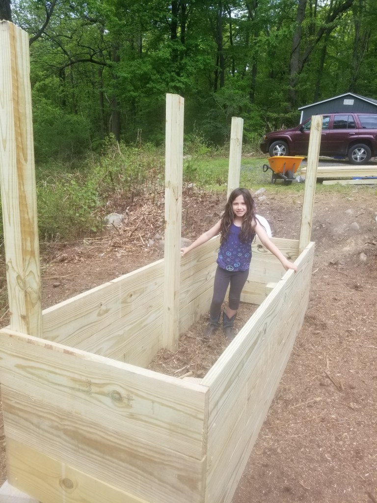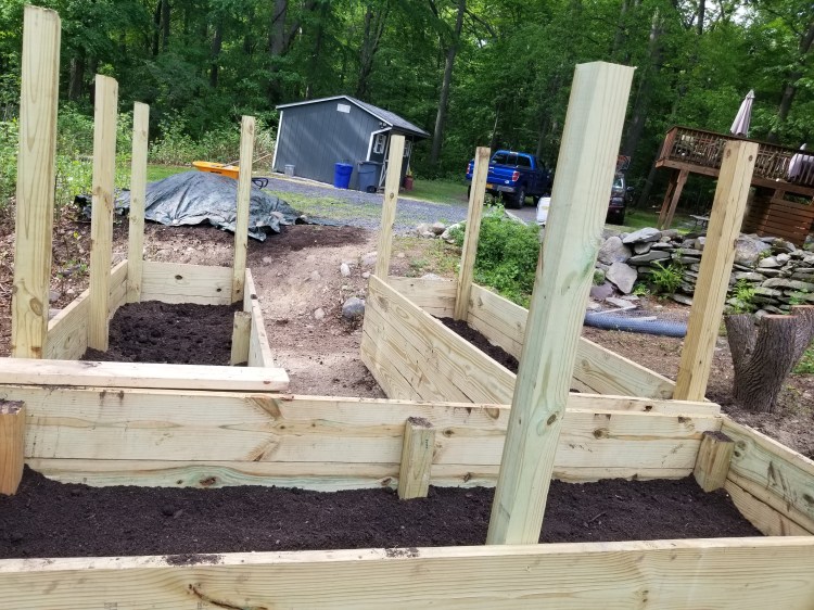 So, the BIGGEST mistake we made was building the first box in our driveway (because it’s level), thinking we’d just carry it down a slope to the garden area in place, one by one… HA HA HA. Newbies. Each 3 x 9 box weighed at least 400 lbs!! We built just one side wall of one box and could hardly drag it down into the garden area, let alone the whole 3 x 9 box. So learn from my mistake – build it in place!