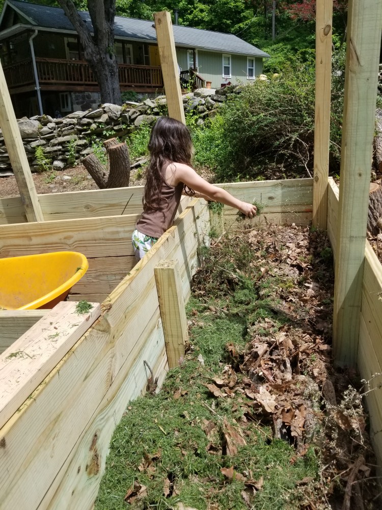 So what does that mean? Going into the woods, grabbing the most rotted spongy wood from trees fallen long back, and laying them along the bottom of your boxes with fresher stumps, twigs, a layer of fall leaves, and lastly some grass clippings. Then finally we purchased some topsoil, compost, and peat moss from our nursery for the final layer we would plant in. 1/3 of each was the best ratio advice I found on this triple mix method, and our garden produced incredibly that summer, so I’d say it worked!