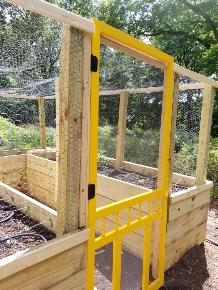 Grab the screen door you bought and hold it in place to make sure it covers the width of the center of the U you created to walk through, and attach the gate to the post with hinges and add a cute door handle and hook and eye to keep it shut. If it doesn’t quite fit add 2 x 4’s inside the door framelike we did. We also opted to paint the gate/screen door bright yellow to match the front door of our house, because that’s the important part.