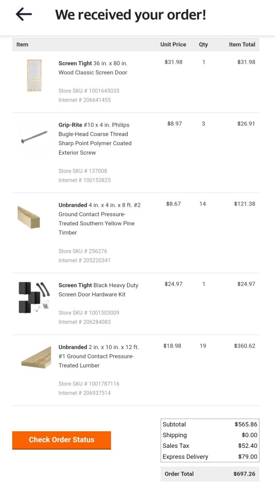 We placed the order online at Home Depot; the total to build an extremely sturdy raised walk-in garden measuring 12ft long x 9ft wide, and 30” raised off the ground was only $697! Including expedited home delivery! Granted, this was in April of 2020, a few months before lumber prices would skyrocket due to the pandemic, supply issues, and labor shortages. The only other items we bought outside of Home Depot were 1” chicken wire from our local Tractor Supply (approx. $100), and then of course a top layer of compost, topsoil, and peat moss from the nursery supply down the road (approx. $200). So all in, we’re looking at under $1000 for a totally enclosed, sturdy, easy-to-use, super cute walk-in U-shaped garden with over 80 square feet of gardening!